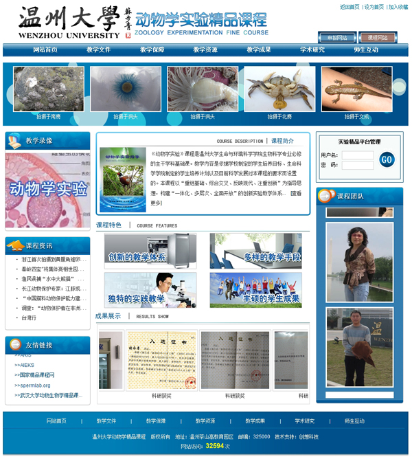 我公司為溫州大學(xué)生命與環(huán)境科學(xué)學(xué)院,建立的動(dòng)物學(xué)實(shí)驗(yàn)精品課程網(wǎng) 經(jīng)浙江省教育廳評(píng)審,被評(píng)為浙江省高等學(xué)校省級(jí)精品課程網(wǎng)站。這也是我公司開創(chuàng)了第一個(gè)省級(jí)精品課程網(wǎng)。同時(shí)也慶祝公司在精品課程網(wǎng)站制作方面更上一個(gè)新的臺(tái)階,同時(shí)希望以后能夠?yàn)楦叩仍盒7?wù),創(chuàng)立更好的網(wǎng)站。